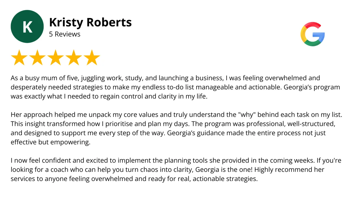 Beliefs: Believe in my capacity to achieve my dreams efficiently and effectively, without succumbing to overwhelm. Prioritising goals with renewed clarity and focus.